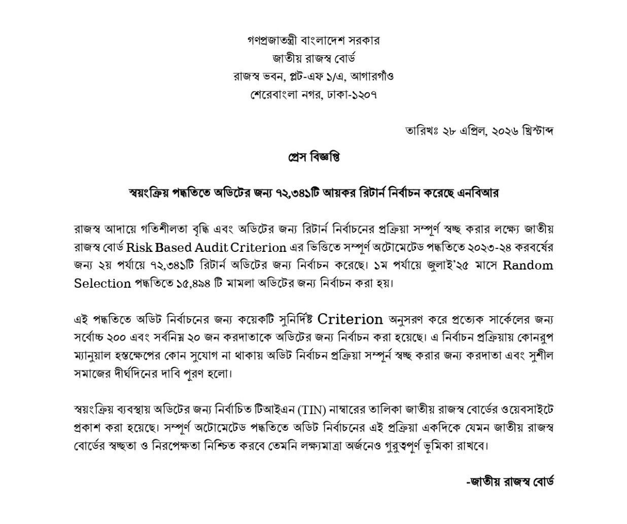 About this tool. The National Board of Revenue (NBR) selected 72,341 income tax returns for audit in the second phase using an automated Risk-Based Audit Criterion for tax year 2023–24. This site lets you search the published TIN list instantly. Source: NBR press release, 28 April 2026.